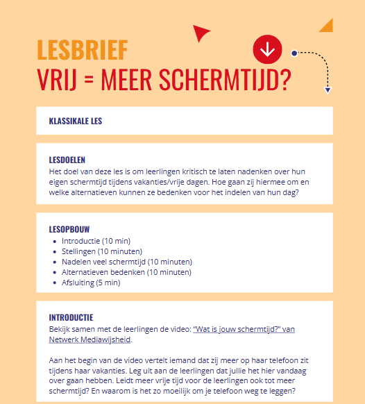Om meer bewustzijn rond schermtijd te creëren, hebben wij lesbrief ontwikkeld voor basis- en voorgezet onderwijs. Het doel van deze les is om leerlingen kritisch te laten nadenken over hun eigen schermtijd tijdens vakanties/vrije dagen. Hoe gaan zij hiermee om en welke alternatieven kunnen ze bedenken voor het indelen van hun dag?