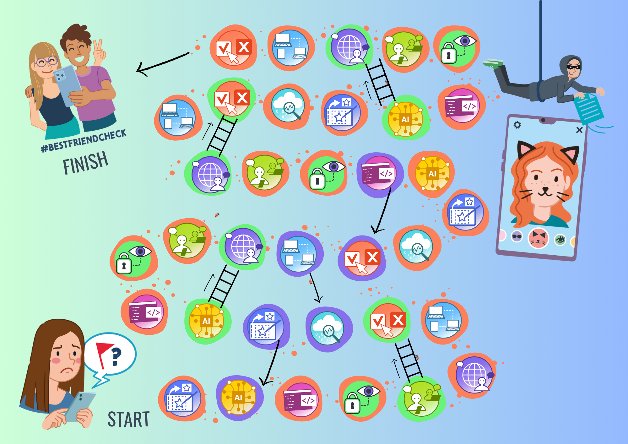 Onderweg kom je digitale shortcuts tegen (die jou supersnel vooruit helpen!), maar ook sneaky foutjes (zoals een nepfilter of een fake account!) die je teruggooien. Net als bij ganzenbord.